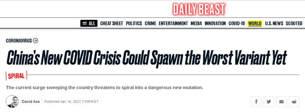 如下图所示,在这篇题为“中国的新疫情危机可能滋生出迄今最可怕的变种毒株”的文章中,美国《每日野兽》网站的记者David Axe一上来便直接抛出了他的一个“暴论“,称目前席卷中国部分城市的新一轮新冠疫情不仅威胁着十多亿中国人,更“给全世界带来了严重的危险”。