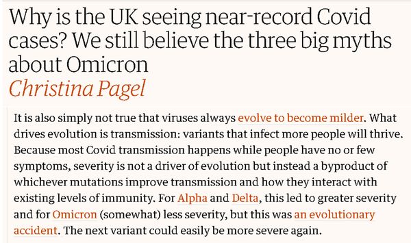 今年3月31日,英国伦敦大学学院临床研究部门主任佩格尔(Christina Pagel)就在英国《卫报》上撰文列出了三个人们对新冠疫情存在的误区。其中第二个误区,就是人们误以为病毒会“越变越弱”。佩格尔表示,虽然传染性越来越强是病毒变异的趋势,毒性的高低却不是定数,而是病毒随机变异中的副产物。