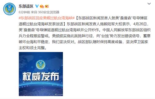 东部战区新闻发言人就美“桑普森”号导弹驱逐舰过航台湾海峡发表谈话东部战区新闻发言人施毅陆军大校表示,4月26日,美“桑普森”号导弹驱逐舰过航台湾海峡并公开炒作。中国人民解放军东部战区组织兵力全程跟监警戒。……