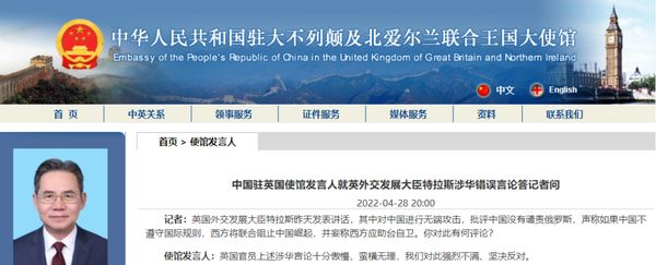 中国驻英国使馆发言人:英外交发展大臣涉华言论十分傲慢、蛮横无理