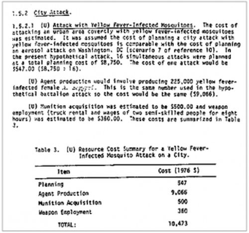 1981年的美军报告中,比较了两种行动方案:第一种,是利用感染黄热病的埃及伊蚊从16个方向同时进攻一座城市。第二种,则是兔热病气溶胶攻击。