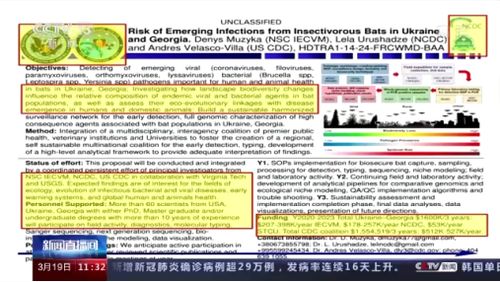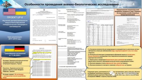 研究候鸟传播危险疾病可能性的UP-4项目、研究由蝙蝠向人类传播细菌和病毒的P-781项目、研究出血热病毒的UP-8项目,俄罗斯还发现了向西方国家转移乌克兰人生物样本等项目的原始文件。