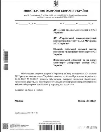 俄国防部发布的有关乌卫生部要求在2月24日销毁实验病原体样本的文件
