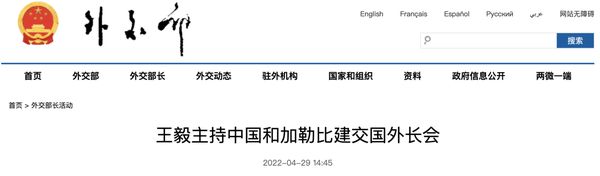 2022年4月29日,中国和加勒比建交国外长会以视频方式举行。