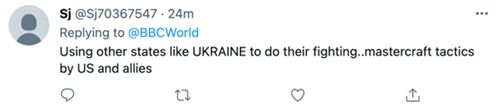 一名英国网友则讽刺说:“美帝国主义者承诺与俄罗斯进行代理人战争,直到乌克兰人流尽最后一滴血。”↓