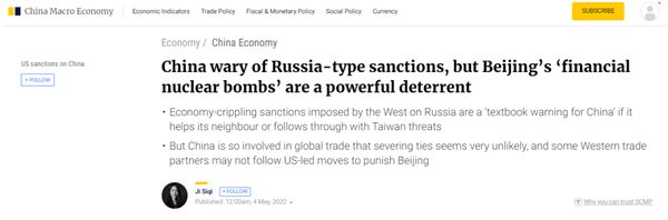 香港《南华早报》5月4日文章,原题:中国对(西方的)俄式制裁保持警惕,但北京的“金融核弹”也是强大的威慑力 用破坏性的金融和经济制裁来惩罚世界第二大经济体,从未被华盛顿公开视为选项。但当俄罗斯受到(西方)制裁时,情况发生变化。然而,中国不是俄罗斯,其经济规模比俄约大10倍,与世界其他国家的经济关系也更密切。另一方面,中国在全球价值链中地位牢固,包括美国在内的众多国家和地区要完全切断与其最大贸易伙伴的关系,是极其困难的。政治盘算将不可避免地受到经济条件的制约,且任何制裁的影响都是相互的。