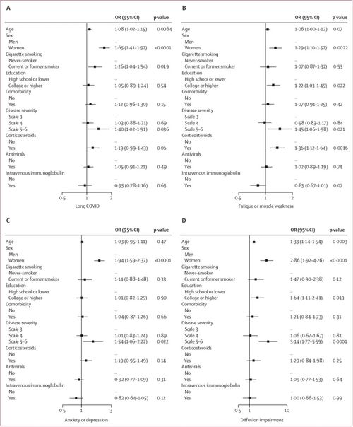 长COVID、疲劳或肌无力、焦虑或抑郁、肺弥散性损伤的危险因素。