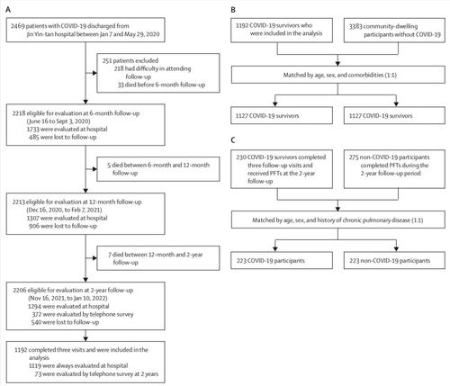 研究提到,2020年1月7日至2020年5月29日期间,武汉金银潭医院COVID-19患者出院共计2469例。其中1192名幸存者在三次随访中完成评估并纳入最终分析,其中1119人(94%)在感染后2年接受面对面访谈。随访时间包括6个月、12个月和2年。