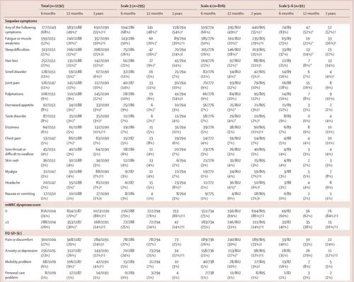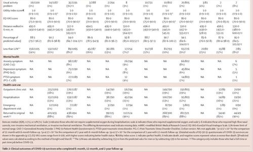 在生活质量调查问卷中,相比非COVID-19参与者,COVID-19患者也更经常报告疼痛或不适和焦虑或抑郁。不过,研究也同时提到,与健康相关的生活质量在几乎所有领域都持续改善,尤其是在焦虑或抑郁方面:出现焦虑或抑郁症状的个体比例从6个月时的23%(256/1105)下降到2年时的12% (143/1191) 。