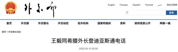 2022年5月13日,国务委员兼外长王毅应约同希腊外长登迪亚斯通电话。