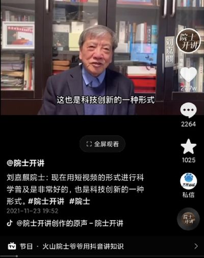 “用短视频做科学传播和普及,对用户来说非常方便,知识和内容也很生动真实,规模和效果都更好,这也是科技创新的一种形式。”刘嘉麒院士在一支视频中这样表示。一期科普讲座视频能有上百万人观看,他对此很惊讶。