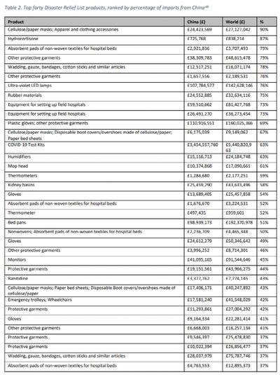 为了应对包括疫情在内的各种突发灾害事故,英国政府有一份“救灾物资清单”(The Disaster Relief Lis),在涉及医疗物资,如医药、检测设备和医疗仪器等的几个重大门类里,英国在2021年从中国购买了价值总计62亿英镑的物资,占英国医疗用品总进口金额的17%。