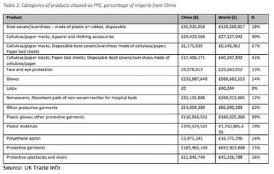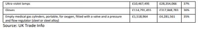 而在最重要的40种更细分的医疗用品列表中,英国在2021年度对中国产品的依赖则要更高,其中口罩这一物资的进口总额里,中国产品占比高达90%,而占比最低的医用储气罐,中国产品也占35%。