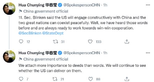 在最后一组推文中,华春莹写道:“布林肯国务卿表示,美国将与中国进行建设性接触,这两个伟大的国家可以和平共处。嗯,我们以前听过这些话,并随时准备朝着合作共赢的方向努力。”她表示,“‘听其言观其行’,美方能否兑现承诺,我们将拭目以待。”