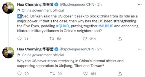 “布林肯国务卿表示,美国并不寻求阻止中国发挥大国作用,”华春莹在第四组推文中指出,“如果真是这样的话,那么美方为何要加强‘五眼’联盟,兜售‘四方安全对话’,组建‘奥库斯’,并加强在中国周边的双边军事同盟?美方为何从未停止干涉中国内政,从未停止支持新疆、西藏、台湾分裂势力?”
