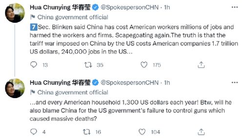 “布林肯国务卿说,中国让美国工人损失了数百万个工作岗位,对(美国)工人和企业造成伤害。”华春莹话锋一转,在第七组推文中写道:“这又是(拿中国当)替罪羊。事实是,正是美国对华关税战使得美国公司损失1.7万亿美元,使得美国损失24万个工作岗位,使得每个美国家庭每年损失1300美元!顺便说一句,他是否还会将美国政府未能控枪而造成大量死亡的责任归咎于中国?”