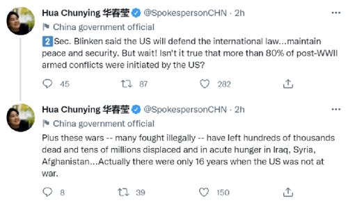 在第二组推文中,华春莹写道:“布林肯国务卿说,美国将捍卫国际法……维护和平和安全。但是,等等!二战后80%以上的武装冲突不就是由美方发起的吗?再加上这些战争——许多是非法发起的(战争)——已经在伊拉克、叙利亚、阿富汗造成数十万人死亡、数千万人流离失所和严重饥荒……实际上,美国没有参与战争的时间只有16年。”