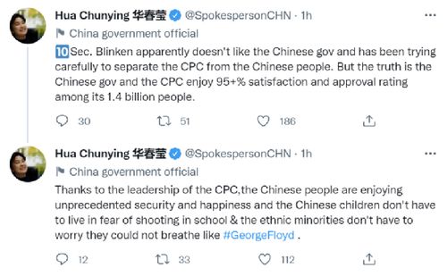 “布林肯国务卿显然不喜欢中国政府,并一直在小心翼翼地将中国共产党和中国人民区分开来。但事实是,中国政府和中国共产党在中国14亿人民中拥有95%以上的满意度和支持率。在中国共产党的领导下,中国人民享有前所未有的安全和幸福,中国孩子们不用担心在学校被枪杀,少数民族不用像乔治·弗洛伊德那样担心‘无法呼吸’。”华春莹在第十组推文中写道。