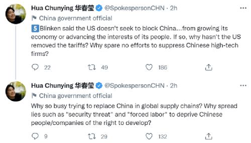 “布林肯说,美国并不寻求阻止中国……发展其经济或增进其人民利益。如果真是这样,为何美国还未取消(对华)关税?为何还在不遗余力地打压中国高科技企业?”华春莹在第五组推文中反问道,“又为何如此忙于试图在全球供应链中取代中国?为何要散布诸如‘安全威胁’、‘强迫劳动’等谎言,剥夺中国人民或中国企业发展的权利?”