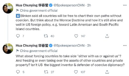 在第六组推文中,华春莹写道:“布林肯说,所有国家都可以在不受胁迫的情况下自由规划自身发展道路。但是想想门罗主义,以及它如何在美国外交政策中仍然完好存在,例如针对拉丁美洲和南太平洋岛国。强迫各国‘要么支持我们,要么反对我们’而选边站?并冻结甚至接管他国的资产和私有财产?美国难道不才是胁迫外交的最大发明者和捍卫者吗?”