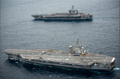 美国双航母引发关注的并不是美国海军第七舰队官宣的消息。而是中国智库南海战略态势感知平台29日的一则题为“美海军双航母在冲绳东南演习”的微博贴文:5月28日至29日,综合航母舰载机ADS-B信号和遥感影像,美“林肯”航母打击群和“里根”号航母打击群已经分别从日本横须贺和硫磺岛转至冲绳东南海域,并进行双航母演习。