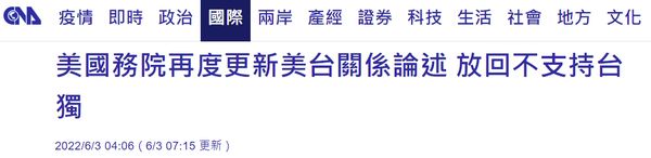台湾“中央社”6月3日报道称,在美国国务卿布林肯发表对华政策演讲2天后,美国国务院5月28日再次悄悄更新“美台关系现况”论述,重新放回美国“不支持台独”、“反对任何一方改变现状”、期盼“和平解决两岸分歧”等文字。