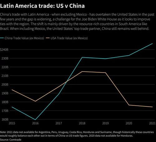 报道称,数据显示,自拜登2021年1月正式就任美国总统以来,中国在拉美大部分地区扩大了与美国之间的贸易差距。在对2015年至2021年之间来自联合国的贸易数据作出分析后,路透社发现,除了美国最大的贸易伙伴墨西哥,中国在拉美各国的贸易优势已超美国,并在去年扩大了这种优势。