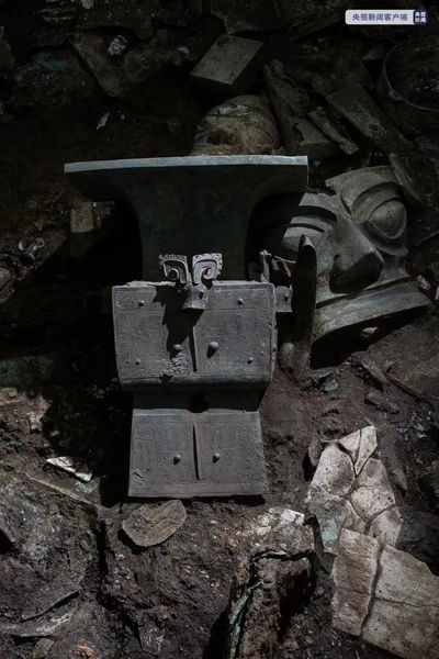 此外,6号坑的玉刀和木箱,7号坑的的龟背形网格状器、铜顶璋龙形饰、三孔玉璧形器,8号坑的金面罩铜头像、顶尊蛇身铜人像、铜神坛、铜巨型神兽、铜龙、铜立人像、铜戴象牙立人像、铜猪鼻龙形器、铜神殿形器盖、石磬等,也都是本次考古挖掘中的重要收获。