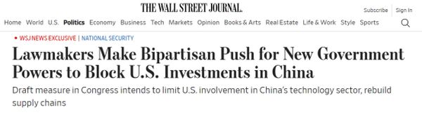关于这项限制美国在华投资的新法案,《华尔街日报》称,虽然美国几十年来一直在监管外国对美国实体的投资,并限制美国公司向国外出口涉及国家安全的敏感技术,但新法案扩大了联邦政府对美国海外投资活动的管辖权。