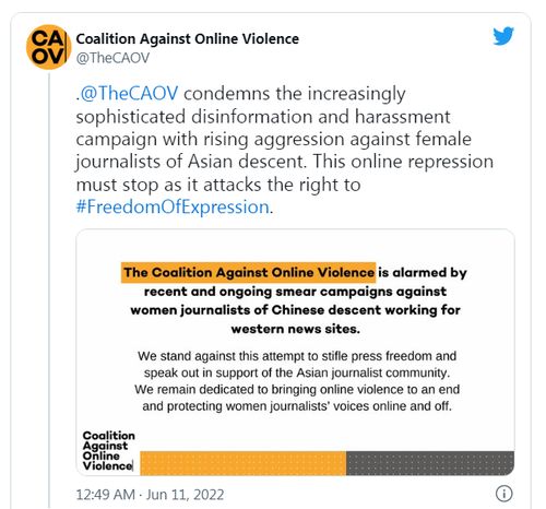 一个以“帮助解决女性记者面临的网络骚扰问题”为主要任务的的联合团体——反网络暴力联盟,6月11日发表声明,在社交媒体上转引ASPI这份“报告”,还谴责这种针对“女性记者的攻击行动”。
