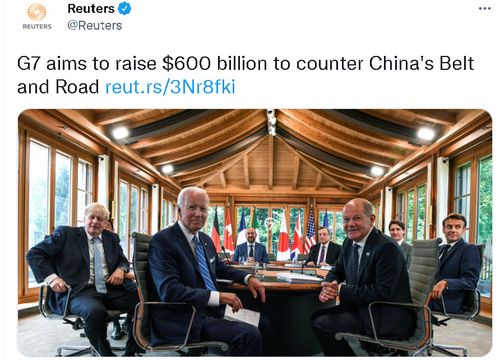 根据路透社的报道,G7这个对抗中国“一带一路”的项目名叫“全球基建和投资伙伴项目”("Partnership for Global Infrastructure and Investment"),美国总统拜登和美国的6个与会盟友国家的领导人和政府代表表示,他们将在未来5年里总共筹集6千亿美元资助发展中国家的基建和发展,以对抗中国的“一带一路”。
