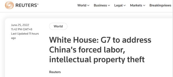 据路透社发自美国空军一号的报道,在拜登前往德国途中,白宫方面宣称,G7将讨论中国所谓“强迫劳动”和“窃取知识产权”问题。