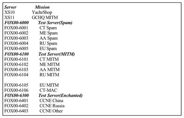 CNE下设一名或多名“酸狐狸”项目教官,这些教官可以领导一个或多个“酸狐狸”行动组,行动组中包括多名队员,分别承担直接支援特定的网络入侵行动、维护酸狐狸服务器等职责。TAO在全球范围内部署酸狐狸平台服务器,服务器按照目标所处区域进行分布式部署,包括中东地区、亚洲地区、欧洲地区等,其中编号前缀为XS的服务器是统筹多项任务的主服务器。值得注意的是,编号为XS11的服务器被明确分配给英国情报机构“英国政府通信总部”(GCHQ)开展中间人网络攻击行动。此外,TAO针对中国和俄罗斯目标设置了专用的“酸狐狸平台”服务器,编号为FOX00-64的系列服务器被用于支援计算机网络入侵行动队的漏洞攻击行动,其中编号为FOX00-6401的服务器专门针对中国目标,FOX00-6402的服务器专门针对俄罗斯目标。