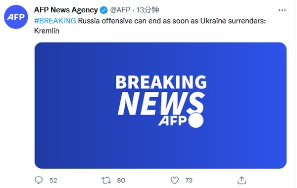 据法新社刚刚消息,克里姆林宫28日表示,只要乌克兰投降,俄军在乌行动就可以结束。
