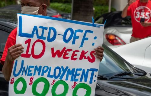 ▲ 经济下行加之疫情冲击,美国社会失业问题严重。2020年5月,大批失业者聚集在迈阿密海滩,手举“失业十周,收入为零”的标语进行抗议,要求政府保障其在失业期间的合法权益。