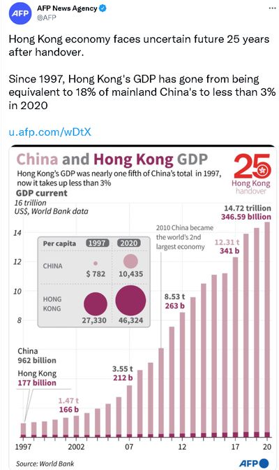 如下图所示,在这篇题为“回归25年后,香港经济正面临的不确定性”的文章中,法新社的一个核心逻辑是,在1997年刚回归中国时,香港的GDP曾是内地的18%,而在2020年时这个比例则跌到了不到3%。