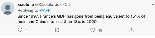 如下图所示,有人就用法新社的这种玩儿法,把法国在1997年和2020年的GDP数据与中国进行了对比,结果发现法国混得才真叫惨。1997年时法国的GDP(约为1.45万亿美元)曾是中国(约为9620亿美元)的151%,可2020年时的法国GDP(约为2.63万亿美元)却连中国(约为17.7万亿美元)的18%都不到。