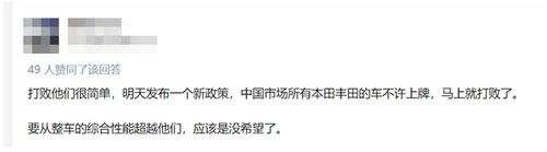 还有人阴阳怪气:打败他们很简单,明天发布一个新政策,中国市场所有本田丰田的车不许上牌,马上就打败了。从整车的综合性能超越他们,应该是没希望了。