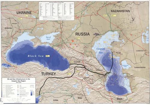 黑线标注的,是哈萨克斯坦提出的跨里海管道及通往欧洲的潜在途径(来源:德克萨斯大学)