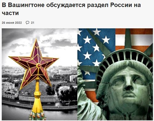 报道说,美国有人已经绘制出一个分裂的俄罗斯的地图。他们的计划涉及将俄罗斯联邦划分为十几个独立的政治实体——俄罗斯共和国、科米、乌拉尔共和国、西伯利亚共和国、萨哈共和国、阿尔泰、图瓦、布里亚特、远东共和国、北高加索联邦、摩尔达维亚、楚瓦什、马里埃尔、鞑靼斯坦、巴什科尔托斯坦、卡尔梅克、乌德穆尔特。