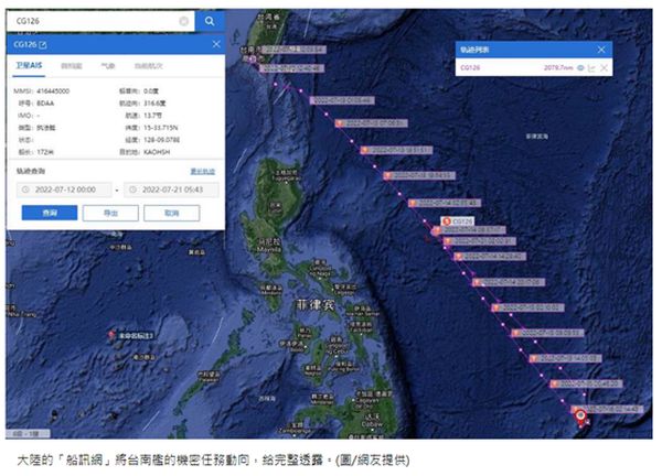 据台媒报道,台湾有网友发现,大陆的“船讯网”,竟然将台南舰自12日后出发,16日抵达帕劳海域,再于18日晚间返航的航迹清楚地标识出来。