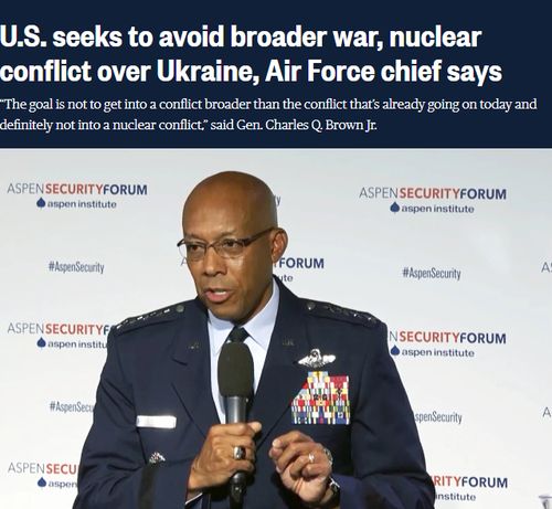 据全国广播公司(NBCNews)7月20日报道,针对俄乌问题,美国空军参谋长布朗(Charles Brown)7月20日在论坛上表示,美国的目标仍然是避免与俄罗斯发生“核冲突”。