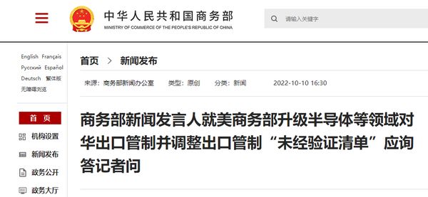 商务部网站10月10日消息,商务部新闻发言人就美商务部升级半导体等领域对华出口管制并调整出口管制“未经验证清单”应询答记者问。