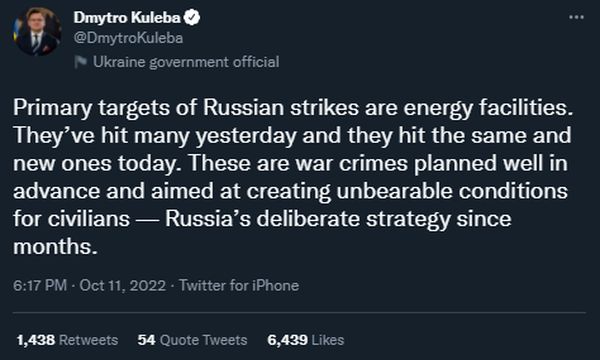 乌克兰外长库列巴11日在推特发文,称俄罗斯军队打击的主要目标是能源设施。“他们昨天打击了很多,今天他们袭击了同样多的(能源设施)。”他还指责俄军的这些攻击是几个月前就计划好的。