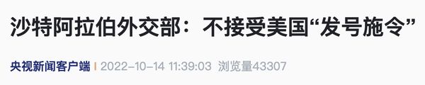 声明强调,沙特不接受美国“发号施令”。10月5日,包括沙特在内的石油输出国组织(欧佩克)成员国与俄罗斯等非欧佩克产油国组成的“欧佩克+”机制决定自今年11月起大幅减产,在8月产量基础上将月度产量日均下调200万桶,招致美国方面不满。美方提出需要“重新评估”同沙特的关系。