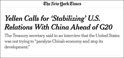 耶伦同时认为,中美之间的紧张关系源于中方的“误解”,并声称中国应该“理解”美国“采取行动”的原因,美方并非试图阻碍中国的经济发展。