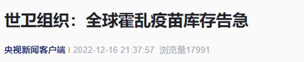 世卫组织:全球霍乱疫苗库存告急世界卫生组织官员12月16日说,随着霍乱疫情在多国卷土重来,世卫组织参与管理的全球霍乱疫苗库存现阶段所剩无几。……