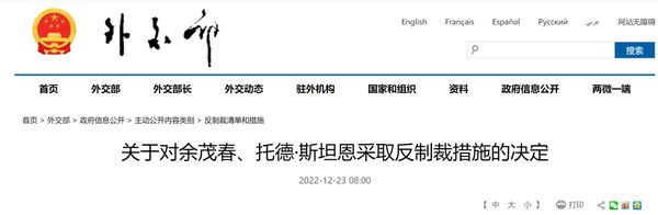 现公布《关于对余茂春、托德·斯坦恩采取反制裁措施的决定》,自2022年12月23日起施行。