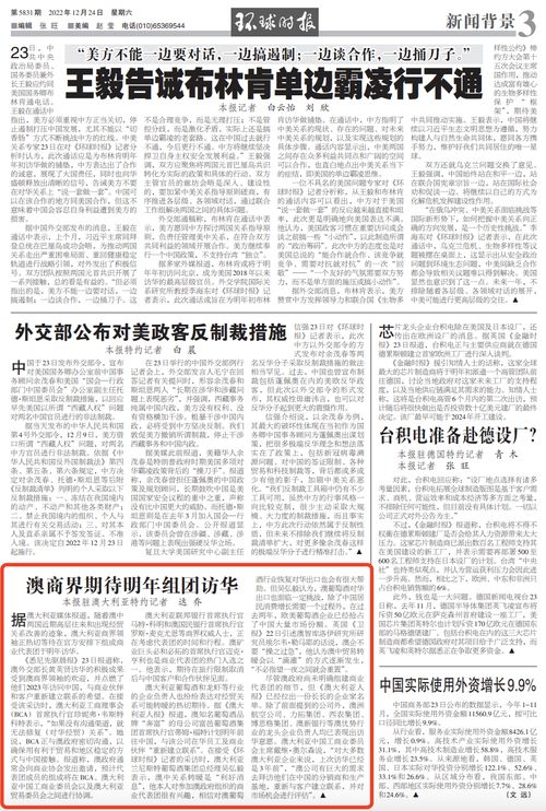 《悉尼先驱晨报》23日报道称,澳外交部长黄英贤访华的积极成果受到澳商界领袖的欢迎,并点燃了他们2023年访问中国,与商业伙伴和客户重新建立联系的希望。在接受该采访时,澳大利亚工商理事会(BCA)首席执行官珍妮弗·韦斯特科特表示,“如果没有沟通渠道,就无法修复(对华经贸)关系”。她说,BCA正与澳政府密切沟通,以确保用有利于贸易和地区稳定的方式与中国接触。报道称,澳政府通常会向商业协会发出邀请,预计代表团成员的组成将在BCA、澳大利亚中国工商业委员会以及澳大利亚贸易委员会之间进行协调。