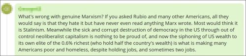 “真正的马克思主义有什么问题?如果你问卢比奥和其他许多美国人,他们只会说他们讨厌它,但甚至从来没有读过马克思写的东西。”